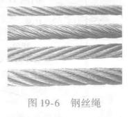鋼絲繩(圖19-6)是用優(yōu)質(zhì)高強度碳素鋼絲制成的繩索,先將若干根鋼絲擰成鋼絲股,然后再由幾個鋼絲股繞一繩芯擰成繩索。鋼絲繩的繩芯可以是麻芯(棉芯)、石棉芯、金屬芯等。鋼絲繩主要用來捆綁、起吊、拖拉重物,是起重工作中最常用的繩索之一。