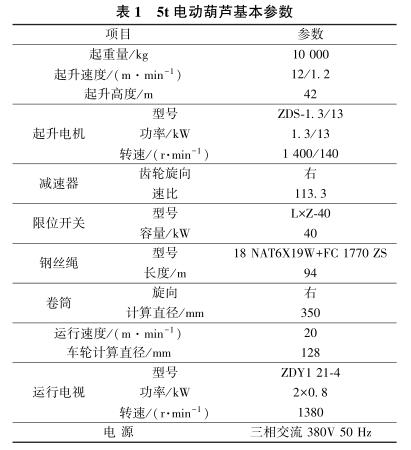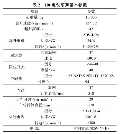 移動式電動葫蘆吊物系統(tǒng)主要由5,10t 電動葫蘆、電動葫蘆運行軌道及電氣控制系統(tǒng)組成。 在結構邊跨設吊物孔,吊物孔處1,2 層及地下室各層梁板結構留空,在3層主體結構梁下(高度≥8m),利用3層結構梁板作為支承,支承梁板及洞口邊梁進行結構加強。移動式電動葫蘆吊物系統(tǒng)利用3層結構梁預埋對穿螺栓、主體結構施工時的支模架改作操作平臺及塔式起重機、手動葫蘆等工具配合完成安裝,經(jīng)荷載試驗及驗收合格后方可使用。5,10t電動葫蘆基本性能參數(shù)分別如表1,2 所示。