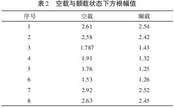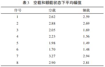 檢測時,電動葫蘆應(yīng)處于規(guī)定的運行狀態(tài),即電動葫蘆在額定轉(zhuǎn)速、額定電壓下的穩(wěn)定工作狀態(tài)。如果所測振動大于該方法所允許接受的范圍,且受過度背景干擾,應(yīng)停機(jī)進(jìn)行檢測,以確定外界的影響程度。機(jī)器靜止時所測振動烈度值(速度的均方根值)超過運行時的25%,必須進(jìn)行修正,以減少背景振動對檢測的影響。本研究選擇鋼絲繩電動葫蘆空載時對其運行狀況進(jìn)行檢測??蛰d運行時,將采用振動檢測的方法得到的速度的均方根值中最大值作為參考數(shù)值。此外,對選擇在空載還是帶載的情況下對電動葫蘆進(jìn)行檢測也進(jìn)行了研究。對電動葫蘆減速箱進(jìn)行檢測的同時,不考慮電動葫蘆沿軌道運行的情況,因為這時減速箱并不工作,而只考慮電動葫蘆的空載升降、帶載升降狀態(tài)。針對這樣的狀況,在試驗過程中選取了8臺電動葫蘆,分別對這8臺電動葫蘆空載上升、額載上升的兩種穩(wěn)定的工作狀態(tài)進(jìn)行振動檢測,得到振動烈度、方根幅值、平均幅值這三個主要參數(shù),并分析上述兩種狀態(tài)下這三個參數(shù),參數(shù)與分析見表1、表2、表3